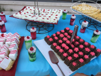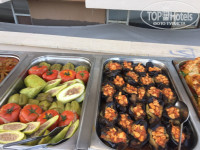 Обед: Глаза разбегаются! Мясо есть всегда: это курочка тушеная с разными овощами. А также курица с картошкой тушеные. Вкусно, не пресно. От овощей ломится стол: и зеленые салаты с руколой и всякой травой, и с пекинской капустой, и огуречно-помидорные, и перец есть, и капуста обычная, помидоры, огурцы, перец болгарский, редька, и капуста фиолетовая, тушеные перцы, баклажаны, кабачки, шпинат ( вкуснятинааа!!!) В изобилии маслины и оливки разные. Можно собрать греческий салат. Соусы всякие, масло, лимонный и гранатовый сок в вазах для добавления в салаты есть всегда.. Из гарниров булгур, рис, макароны, картошка, перловка ( даже она у них со вкусом приготовлена). Есть суп. Иногда невкусный. Сыров опять целая куча. Фрукты опять присутствуют. Ну и как на зло куча сладостей!!! ( нет бы с утра давать хахахха) Всякие пирожные: бисквитные, как суфле с разными вкусами, со взбитыми сливками, похожие на манник, но вкусные. Без проблем можно после обеда вынести за пределы столовой пирожные и понаслаждаться под сенью деревьев с чашечкой кофе ( или забрать в отель). Из напитков кофе из автомата с молоком и без, чай, соки, можно прямо в столовой не обязательно на баре попросить газировку.
