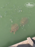 Павлины в клетках все там же - ходили посмотреть с ребенком. Также ходили кормить сыром черепах на мост. На рецепшн подсказали, что они приплывают на кормежку в 9-10 часов утра, были в 10 - черепах застали, но на голодных они похожи не были. Будете брать сыр в ресторане для них - берите белый, желтый быстро тонет и как-то им не по вкусу. Спокойным шагом занял этот поход у нас полчаса в одну сторону. Направление: если лицом к пляжу - то налево по променаду идти и выйдете к этому мосту через реку. Кстати в той части пляжа где река выходит в море поняли, что наш пляж совершенно пустой в сравнении с пляжами тех отелей - людей как в Крыму в былые годы - немеряно, и это середина мая.