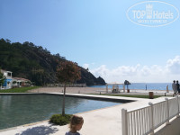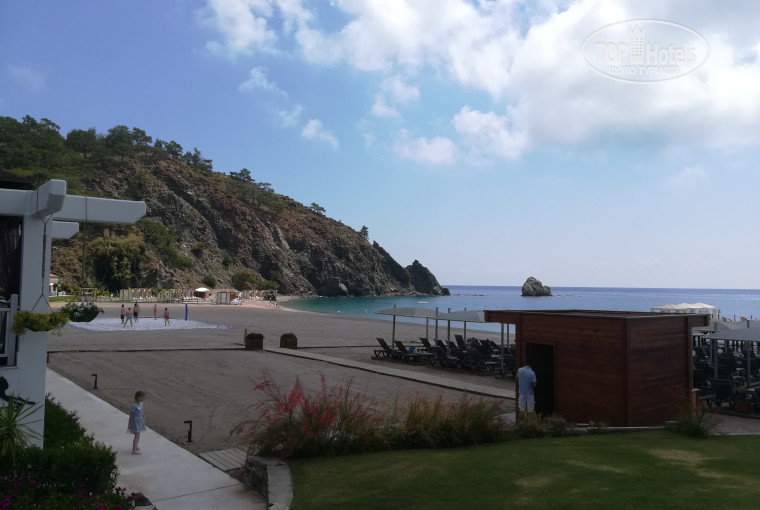 Сразу отмечу что очень красивое место. Вся территория очень ухоженная(идеальные газоны, фонтаны, много зелени, много бассейнов, искусственная речушка, очень чисто). Повсюду видны горы. Пляж просторный с беседками, столиками, диванчиками, бесплатным баром, есть где перекусить.