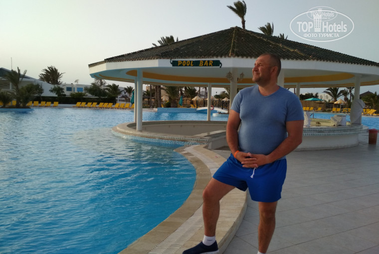Отдыхали вдвоем с мужем,прочитали много отзывов об этом отеле,ехали с опаской,ну и зря! Замечательный отель,уборка в номере каждый день,полотенца меняют раз в 2 дня,номер нам достался на втором этаже,никаких насекомых,номер светлый, просторный,туалет и ванна раздельные.Море в 2-х минутах от отеля.Лежаков всегда хватало и у бассейна и у моря.Ресторан просто супер,еда разнообразная,много и очень вкусная,мороженное,сладости, фрукты (клубника,дыни,арбузы,персики,нектарины),сыры,были и крабы и мидии, очень вкусное вино(мне понравилось красное),пиво тоже не плохое,вообщем голодными никогда не оставались.Персонал очень доброжелательный,всегда здороваются и улыбаются. Аниматоры стараются во всю,развлекают и детей и взрослых,днем аквааэробика в бассейне,дартс,волейбол на пляже,бочча, вечером детская анимация и взрослая (шоу,танцы). Есть не плохая кафешка у моря на пляже,мы брали там рыбу дорадо на гриле,вкуснятина!За две недели отдыха побывали на трех экскурсиях,были 2 дня в Сахаре (очень рекомендуем),на морской экскурсии на пиратском корабле и на обзорной экскурсии по Джербе (она нам досталась бесплатно в подарок при покупке первых двух).Отдых удался,всё было просто замечательно,прекрасный отель ,отличный персонал,рекомендуем,не пожалеете! Ваш отдых зависит только от Вас самих, с каким настроением Вы едете, а минусы можно найти везде. Нам очень всё понравилось!!!!!!