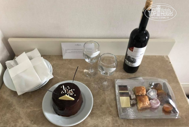 По территории ездят электромобили,это очень удобно,не надо тоскаться с чемоданами,и это удобно персоналу,сели в эту чудо машинку и поехали с чемоданами в номер!В номере стоял Призент, бутылка вина фрукты и торт! У нашего папы был день рождения! Очень приятно!!