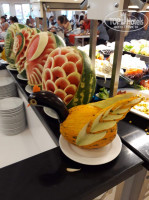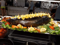 Питание очень хорошее. Вкусно, разнообразно. Вкусные супчики, много фруктов (персики, клубника, арбузы, дыни, черешня, нектарины). Мясо на гриле, картошка вареная, фри. Курица, рыба жареная, пареная. Зелень, салаты (не очень), оливки, маслины, овощи, десерты (так себе), оладьи, яичница по утрам и многое другое. Вполне сносно. Из напитков Кола, Фанта, Спрайт, пиво, порошковые соки. В ресторане экономят на кондиционерах. Включают по великим праздникам. В помещении душно, на улице на терраске более или менее. Несколько раз видели, как поздравляют с днем рождения. На стол за отдельную плату посыпают лепестки цветов, выносят торт под удары крышками от кастрюль, фейерверк, аплодисменты. Прикольно!