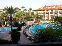 Отдыхали в Alba Resort в конце мая 2018.Вылет наш задержали на 2 часа,поэтому в отель попали в 17 часов,заселили сразу.Нам дали номера в 9 корпусе с видом на 2 релакс бассейна детский и взрослый,не было слышно анимации,спокойно спали и днем и вечером.Ехали на отдых 2 семьями с маленькими детьми,попросили комнаты рядом,наши пожелания учли и дали номера смежные,т.е в номере была дверь в соседний номер где были друзья,нам было удобно,если кто то отлучался друзья за ребенком всегда приглядывали да и они вместе играли пока родители были заняты.Приехав в 5 мы опоздали на обед и до ужина еще было 1,5 часа,в баре у бассейна закуски подают до 5,попав туда в 17:30 все вошли в нашу ситуацию и детей и нас накормили вкусными лепешками.Еда в отеле понравилась всегда было что покушать, на гриле готовили разнообразную рыбу,курицу,индейку,говядину,так же была баранина,всевозможные овощи в том числе на гриле,были фрукты арбузы,дыни,абрикосы,айва и др. В наш приезд ни разу не было клубники и черешни.Ее продавали на пляже 5 евро за 2 баночки,но мы не покупали,т.к.ездили на базар и там ей закупались,очень вкусная.Так же ездили в торговый центр мега молл там можно и одежду купить и обувь и сумки.На рынке эта категория товаров нам не понравилось брали там только сувениры и фрукты.Рынок работает понедельник и четверг легко самому добраться на маршрутке 1,5 доллара проезд,на такси около 15 долларов в одну сторону.