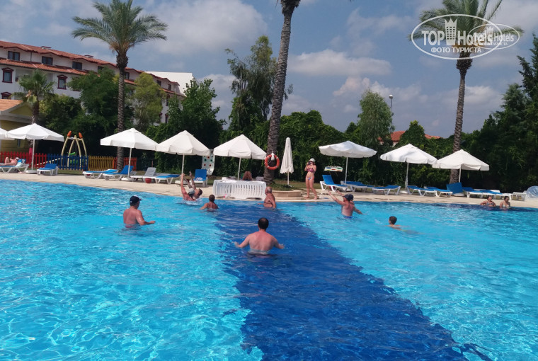 Только вернулись из отеля. Отдыхали с 28 мая по 5 июня. Семья с ребенком 5 лет. Сразу отмечу, что в отеле были только русскоговорящие туристы. На рецепшене многие говорят по-русски и понимают что мы от них хотим. Заселили нас очень быстро в дополнительный комплекс через дорогу, поэтому интерьер номера старенький, но нас это не расстроило. Сам отель с большой територрией и 5 бассейнами. Для малышей есть где поплескаться. Анимация рассчитана для детей( мини-диско)и втечение дня детишек развлекают в игровой комнате. Молодежи там делать нечего, будет скучновато на мой взгляд. Море теплое, берег песчаный, лежаков много, всегда есть свободные. Питание хорошее, много было фруктов( персики, яблоки, сливы, абрикосы, арбузы, черешня). Овощи и рыба на гриле. Особенно большой выбор выпечки, тортов, пирожных. Супер вкусные булочки, у нас я таких не пробовала нигде. Минусом оказалась уборка номера, т.к. убирал парнишка и вытирал только пол иногда, что вся грязь оставалась на месте))) пыль вообще никто не вытирал и постельное тоже не менялось. Один раз полотенца заменили(( как то так. Самостоятельно ездили в античный Сиде( стоили нам дорога 3 у.е. за проезд). Посмотрели все сами. Еще ездили в торговый центр Ново- Молл вроде называется, там есть и вай-ки-ки и продуктовый отдел. В целом отдых понравился, но уже посмотрели бы другие места и отели. Один раз посетить рекомендую.