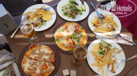 Бар на пляже с 10 утра (вода, чай, кофе, безалко напитки), с 11 айран + гезлеме. В кафе рядом с пляжем тоже айран + алко , еда по меню , особенно пицца с тунцом нам понравилась + рыба дня (форель, сибас, скумбрия), заказ принимает официант, исполнение заказа буквально 5 мин, всегда оч быстро, в главном ресторане обед больше выбор, но нам нравилось рядом с пляжем из-за тишины и красивых видов.