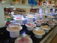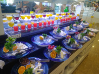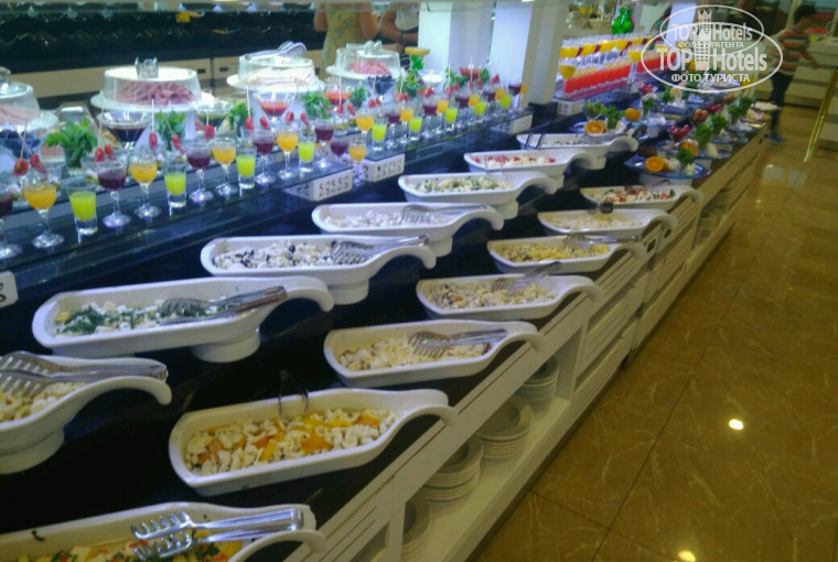 Питание. Само питание хорошее. Без изысков, но разнообразие есть, все вкусно. Первый и второй день почему-то была проблема с молоком, совсем не было огурцов, на завтрак не было блинчиков... Потом питание наладилось. На завтрак давали блинчики, омлеты, яйца, разные колбаски и сыры, мюсли и хлопья, фрукты. Каша была, но не пробовала. Есть апельсиновый фреш (выдавливать нужно самим). На обед было два вида супа, детям не понравились, сама не пробовала. Рис, макароны, пюре, рыбка тушеная, курица, баклажаны, кабачки, картофель фри, картофельные шарики, пита, салатики, овощи, зелень, фрукты (черешня, алыча, дыня, арбуз, яблоки, апельсины - каждый день, абрикосы, сливы, нектарины, персики - чередовались). На ужин давали рыбку гриль, ну и тот же ассортимент, что перечисляла выше. Из сладкого был огромный выбор пироженок, пахлавы, тортиков, десертов из манки и куча всего.