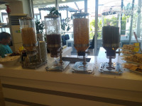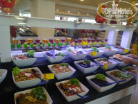 Теперь о самом ресторане. Если приходить в самом начале, то есть возможность сесть за убраный чистый стол, если позже, то столы уже грязные. Официанты не убирают их. Правда на просьбы принести вилки с ножами реагировали и приносили. За напитками нужно самим ходить, т.к. официанты не успевают всех обслуживать. В первые дни официанты ходили вообще угрюмые, потом стали улыбаться :) но чище от этого не стало.