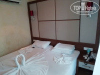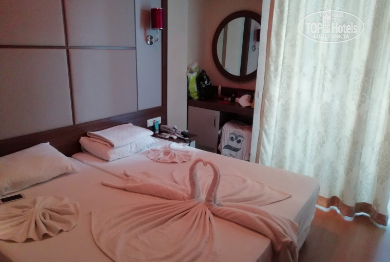 Привет всем читателям сайта! Хочу поделиться своим опытом посещения этого отеля. Приехали мы около двух часов ночи...встретил нас не очень доброжелательный мужчина на ресепшене, (хорошо говорит по русски, похож на казаха больше) Ездили мы от библио глобаса в пометках сделали (молодожены)ну мы реально они, я себе представила там приятные сюрпризы(((Заселили быстро..попросили хороший номер...нам дали блок В, и когда мы зашли в номер возмущению не было предела,в комнате стойкое ощущение сырости,кровати для молодоженов 2 раздельные, номер ну очень маленький 2 кровати и все, кондиционер не чистили видно там никогда вообще, ванна нормальная, но унитаз( на нем был черный волос и ощущение абсолютной антисанитарии. Ну сил ругаться не было, так устали что бросили сумки и спать. Утром пришли на ресепшен был опять он же, протребовав хороший номер он нам отказал,типа у вас супер номер ребята!!а кровати можно сдвинуть, при этом ему было обсолютно все-равно что мы о нем подумаем,,на его стойке было указано оставьте пожалуйста ваши отзывы на этом сайте, он мне давал их отельную книгу жалоб, писать что мы хотим ему все равно, номера мы не добились, менеджера тоже. Вообщем пришли в номер и поняли что не хотим портить свой отпуск на ругань. Я надеюсь, менеджеры учтут этот факт что сотрудник ресепшена не хочет быть на стороне гостей, хамоватый и не приятный. Мы далее это ресепшен стороной обходили,чтоб отпуск и настроение не портить. Ну и вообще в Турции и в Алании не первый раз, сотрудники отеля не очень приветливые. Еда! Ну я не знаю, голодными мы не уходили...к открытию скапливается толпа людей, которые стоят с тарелками и ждут! Столики лучше занимать заранее, на всех не хватает, особенно в обед(весь ресторан под открытым небом) Завтраки не очень, нечего взять, Обед и Ужин лучше,мысо, рыба(однажды была такая костлявая,что не возможно было есть, муж мой в какие-то обеды не наедался т.к из мяса было соевые "типа котлеты" на вкус и вид ужасные...Курица вкусная, была как-то печень вкусная. Мяса кроме курицы нет, салаты стандартные с зеленью...Помидоры что меня удивляет часто были желтоватые(ну блин в Турции есть вкусные помидоры в этот сезон, а часто желтые и не вкусные) Гарниров не много..Из фруктов арбуз, яблоки и груши иногда. Десерты меня расстроили абсолютно, я их не пробовала вообще, они все цвета детской неожиданности с медово-сахарной заливкой, приторно-сладко-невкусные. Еда раз от раза вкусная, либо вообще взять нечего. За 6 дней я ела всегда одно итоже. Разнообразия я не увидела. Плюс это напитки в баре, есть все вино, пиво, джин,тоник, там очередей не было никогда, странно что напитки стоят на полу( и бар как-то оформлен не как бар. В основном в отеле семьи(часто я слышала что дети не хотят есть такую еду), женщины за 45, бабушки и немцы от 45. Главный повар всегда строг, не улыбается, ходил смотрел кто что берет. Но самое что меня возмутило это то что курицу как-то он сам выдавал поштучно!!ну блин тут все включено и брать зажаренную курицу по выдаче вообще возмущает! Написала я тут не лестные отзывы наверное. Но в принципе кушать можно и голодные не останешься, но прочитав все отзывы до меня, я в недоумении. Я не ждала лакшери еды, лакшери обслуживания, я не из таких людей! Но этот отель меня расстроил, он не для молодежи, в баре вечером сидеть скучно. Нормальной музыки даже нет. У мен
