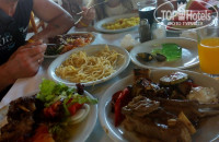 Еда, как и в аква сан вилладж (одна сеть), такая же. Все очень вкусно, выбор мясных блюд большой. Есть каши, супы-пюре. Мороженое на обед и ужин, фрукты (арбузы, дыни, апельсины). Рыба, десерты.