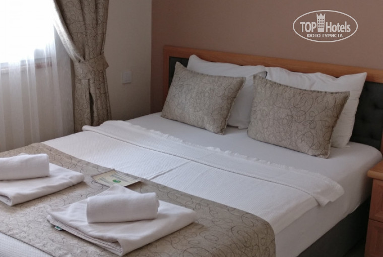Питание - отель работает только на завтрах. Кормят весьма неплохо) Меню стандарт. Стол с мюсли, йогуртом, медом, вареньем, хлебом. Стол со свежими овощами и зеленью. Стол с сырами. Стол с горячим (омлет, яйца, картофан, фасоль, баклажаны). Чай, кофе, пакетированный сок. Свежевыжатый можно купить 10 лир. Мне лично вкусно. Омлет особенно и баклажаны=)