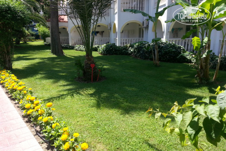 Территория отеля небольшая, но очень ухоженная, садовники работают, все в цветах. Есть два бассейна, горки. Море чистое, даже на глубине дно видно. Берег - камешки, можно с пирса прыгать в воду. Места у бассейна и моря можна и днем найти, но лучше утром занять. В июле-августе народу побольше будет.