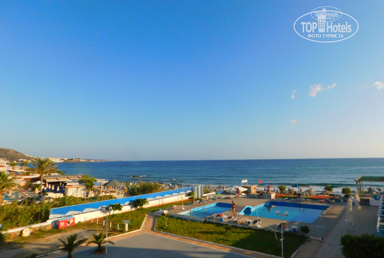Вид из отеля шикарный! Море, горы... Всё можно увидеть на моих фото. Кстати в номерах двери на балкон необычные и создают приятную греческую атмосферу( может как то неправильно выразилась, но впечатления положительные)