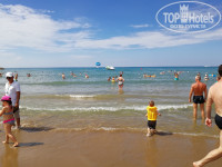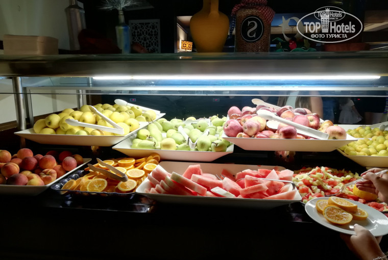 К плюсам- питание, просто великолепное, в отеле, на пляже. Всегда вкусно, разнообразно и всегда много. В меню постоянно рыба, курица, индейка, говядина. В турецкую ночь был даже говяжий язык, безумно вкусный. Из фруктов - яблоки, груши, арбузы, дыни, слива, персики, бананы, черешня, абрикосы, грейптфрукты, в общем нам не давали только клубнику, которую можно недорого купить в магазине. Множество йогуртов на завтрак и различных сухофруктов, сладостей столько, что попробовать все невозможно. Еда была достойного уровня даже на пляже, мы обедали всегда на пляже и в ресторан в отеле не ходили.