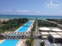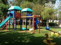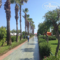 От корпуса отеля к пляжу ведет аллея, условно разделяющая территорию на две зоны. Вдоль аллеи - пальмы, кустарники, цветники, газоны. Справа - ресторан, амфитеатр (афишки в лифтах ежедневно оповещают о предстоящих шоу, скучно не будет), снэк и бич-бары (вечерами - живая музыка), различные киоски (кукуруза, мороженое, вафли), перемежаемые зелеными тенистыми лужайками. Слева - сплошная гладь бассейнов, простирающихся метров на 300 до самого пляжа. Бассейны различной глубины от малышковых 40-см, до 2,5 метров глубиной, что крайне редко встречается. У одного из бассейнов оборудованы весьма солидные водные горки, что также нечасто встречается непосредственно в отелях. За бассейнами, в стороне от шума и суеты, неожиданно обнаружил настоящую релаксационную зону - зеленые лужайки под сенью лиственниц и пихт с их неповторимым в летний зной хвойным ароматом, развешанные гамаки, где вполне комфортно можно расположиться насытившись пляжем. Здесь же имеется весьма приличный теннисный корт (правда в стоявшую жару он пустовал). В самом здании отеля при выходе на территорию имеется небольшой, но уютный тренажерный зал.