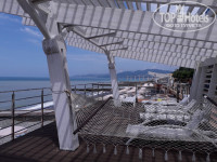 1. В санатории свой пляж, разделен на зоны волнорезами. Для корпуса Приморский 4 и 5 зона. Лежаков и зонтиков много, всем хватает, есть навес с лежаками и гамаками. На пляже мелкая галька, крупных валунов нет.