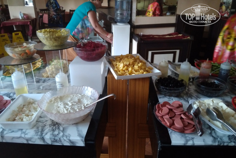Десертный стол - всегда, фруктов немного, но были. Всегда чай, кофе вода, соки нет смысла ругать - только в люкс отелях они свежевыжатые. На завтрак всегда яичница, омлет, оооч вкусные хлебо булочные изделия и я влюбилась в варенье из розы + молочко, ммм. Небольшой минус - это ломающаяся кофеварка в лобби-надо следить за этим.