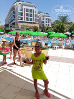 Отдыхали с 1по10 июля. Тур покупали в конце мая, тогда отзывы по отелю были очень даже ничего. Потом понеслось... Честно хотела тур поменять, с детьми ехать боялась. Оказалось зря. Все отрицательные отзывы написанные здесь пишут либо поклонники Летучей либо привереды. Это был наш 4ый отель. До этого отдыхали в 5ках:Grand Haber, Limak Limra, Club Paradiso. Перечисленные отели тогда входили в пятёрку лучших отелей своего региона. И если честно особый разницы я не заметила. Только цена!!! Начнём. Заселение: сразу после приезда в отель в 15.30. Номер стандартный, 1237 на втором этаже. Две кровати, кресло, холодильник, сейф, телевизор, кондиционер. На полу ковролин. Не "ужасно грязный", но и не первой свежести. Уборка так себе, но в номер мы приходили только переночевать, поэтому на него особого внимания не обращали. Все работало исправно, даже ловил Wi-Fi. Ресторан. Мы всегда старались приходить к открытию. Младшая дочь занимала столик (на момент открытия ресторана столы всегда были чистые и сервированы на 3 персоны), ну а мы выбирали еду. Очереди в основном на улице, там где готовят гриль и режут арбузы и дыни. И большие очереди за картошкой фри. Мы её не едим и за ней ни разу не стояли. Этот же картофель при желании можно набрать в снек баре у бассейна. Мясо было всегда, курица, индейка, субпродукты, иногда в рагу встречалась говядина. Диетическое меню есть, правда выбор ограничен и оно бессолевое. Всё кофе машины работали. Алкоголь: водка, раки, пиво почти всегда. Виски, джин и в конце отдыха поялось вино красное и белое. Всё. Система UAL подразумевает круглосуточную работу одного бара(а не то, что там супер пупер что будет) Это был бар у бассейна. Анимация: вот здесь пролёт. Водное поло, дартс, аквааэробика, зарядка. Всё. Всё остальное время аниматоры сидели и пили алкоголь вместе с нашими соотечественниками. Алкаши одним словом. Бассейны. Чистые большие, горки со стыками. Спине больно. Мои дети с них не катались. До обеда мы были на море, а от послеобеденного зноя спасались в крытом бассейне. Мороженное к концу отдыха начали раздавать в двух местах. Очереди, но стоять не так уж и долго. Гезлеме (турецкие лепешки) пекли в двух местах: в баре на пляже и у снек бара. Еды много. Голодными не останетесь. Собираясь в Турцию надо знать что специфика их еды это специи и перец. И не надо писать что еда не вкусная и переперченая. Это не правда. В чужой монастырь со своим уставом не лезут. Пляж грязноват. Песок до входа в море, затем галька и булыжники. Мы купались на территории соседних отелей. Слева это Титан, справа рояль гарден. Там вход хороший и камней таких нет. Увидите, там где хорошо, всегда куча народу. Места всем хватало, спасатели не гоняли. Видели как спасатель выкапывал из песка яйца черепах и закапывал их в другое место где туристы не ходят. Видели двух только что вылупившихся черепашек. Их люди отнесли к морю. Детский клуб. Ничего не могу сказать. Он есть, но уличные качели и всё остальное небезопасно. Ушатано, половина сломана. В клуб ребёнок ходил один раз, ей понравилось, но больше я её туда не пускала т. к. там работает кондиционер, довольно таки прохладно и у нас пошли сопли. Запах у бара есть, но не рвотой как многие пишут, а скисшим пивом пахнет. Когда девушки за стойкой, его нет. Многие писали, что везде грязь и антисанитария. Это не правда. Турки убираются, моют, трут. Отдыхающих намного боль