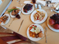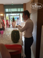 Кормили очень хорошо, за исключением неочень красных арбузов (надо было выбирать и ждать когда подрежут получше), дубовых груш (но как нистранно вкусных), кислых слив. Остального было много, мясо, рыба, разные гарниры, овощи, сладкое, мороженое. Напитки:чай, кофе с автоматов (на вкус какао), газировка, на ужин вино, соки как юпи (ненатуральные). Яблоки и апельсины очень вкусные, один раз давали клубнику, тоже неплохая! Но русские как всегда бегали с тарелками и наполняли их с горой, боявшись остаться голодными. Но поверьте мне голодными там не останетесь точно, все что опустошалось быстро дополнялось, еды много!