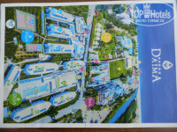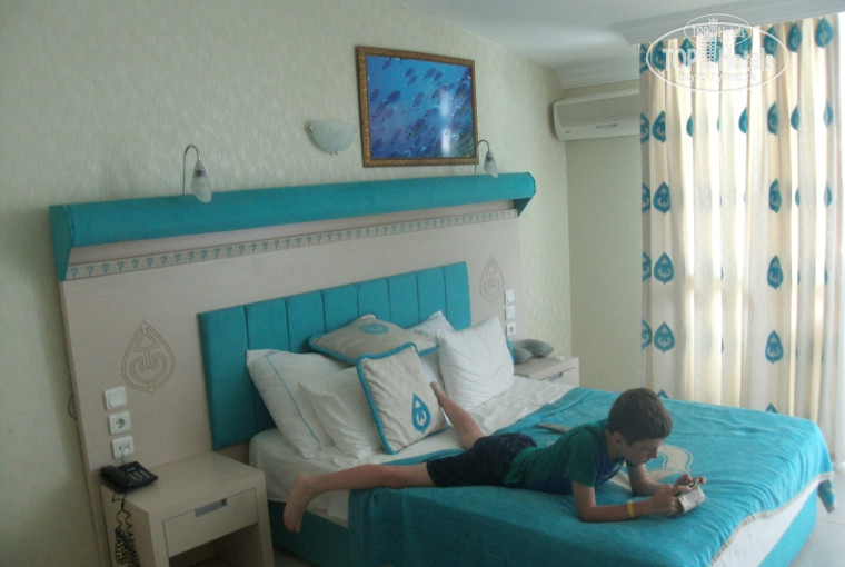 Отдыхала вдвоем с сыном 9 лет. Отель замечательный. Персонал старается, питание разнообразное, вкусное, много фруктов. Приехали в 7 вечера, при заселении предложили на выбор: номер на 4 этаже, но с одной широкой кроватью, либо отдельные кровати, но где-то внизу, возможно цокольный этаж. Выбрала повыше. Достался номер в 4 корпусе (4416) - вид на дорогу и аквапарк. Дорога не беспокоила, хотя чаще открывали балкон, чем пользовались кондиционером (от кондиционера ребенок затемпературил, но быстро справились с этой напастью. Убирали нормально, кроме балкона, полотенца меняли через день, постель через 3-4 дня, мыло, шампуни пополняли, воду пополняли каждый день. Главный плюс - территория и горки. Горки супер! Даже взрослые себе не отказывали! Бесплатный вход в соседний аквапарк, но сходили только один раз - для 9 лет слишком экстремально, свои горки не хуже, а очереди поменьше. Детей помладше развлекают в мини-клубе. Почему же народ снижает рейтинг и оценивает как 4*?! Думаю, что в сравнении с соседними "пятерками" здесь достаточно демократичные цены, поэтому и народ собрался, мягко говоря, попроще, и ведет себя соответственно. Как объяснить людям, что в главный ресторан в парео не ходят! Проходы узкие и голая попа в прозрачной тряпочке в моей тарелке возмутительна! Лень приводить себя в порядок - можно полноценно пообедать в баре на пляже. Также надо администрации на уровне ПРАВИЛ запретить детям до 5 лет самостоятельно разгуливать по ресторану. Турецкие семьи сажают ребенка за стол под присмотром одного из родителей или старших детей и сами приносят им еду, а наши отправляют двухлеток в свободное плаванье с тарелкой в руках, даже не считая нужным самим быть рядом, с дикими глазами хватая еду себе! Малыш крутится, озирается, тарелка наклоняется, содержимое на полу. Персонал, конечно, тут же кидается убирать, но большой дядя с двумя полными тарелками оказывается на месте раньше, и в воздух летит и дядя, и его тарелки! Мой конечно, тоже когда-то был маленьким и создавал проблемы, но это были мои проблемы. За детьми все-же нужно смотреть и ухаживать! В общем, народ мою эйфорию поуменьшил, но в целом, отель хороший. Ехать сюда можно и нужно и не цепляться к мелочам.
