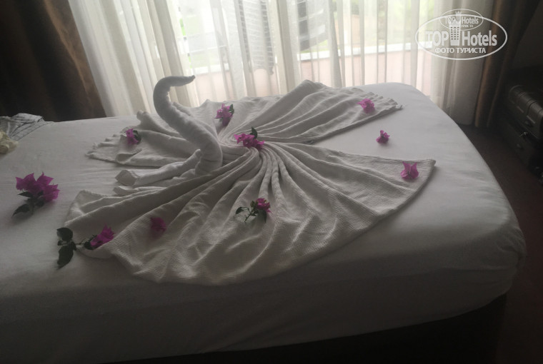 Заселили нас быстро, номер был очень просторный, видом на бассейн (Стандарт, корпус 3), чистый, сантехника новая, телевизор, холодильник,фен, кондиционер все работало исправно на протяжении отдыха. Полотенца всегда менялись, постельные принадлежности белоснежные. Убиралась у нас очень старательная женщина, каждый день, за оставленный 1 доллар все было в цветах, ванная, лебеди из полотенец и так далее. Поэтому отзывы о том, что грязно и так далее, все чушь!!! Мы к тому же приехали отдыхать, а не сидеть в номере и не устраивать программу "Ревизорро" в Турции. Поэтому все для поспать, помыться, собраться было идеально. Территория ухоженная, постоянно подрезают деревья и траву, чистят бассейн после 19:00. По эстетике и чистоте претензий нет, всегда все на высоте!!!