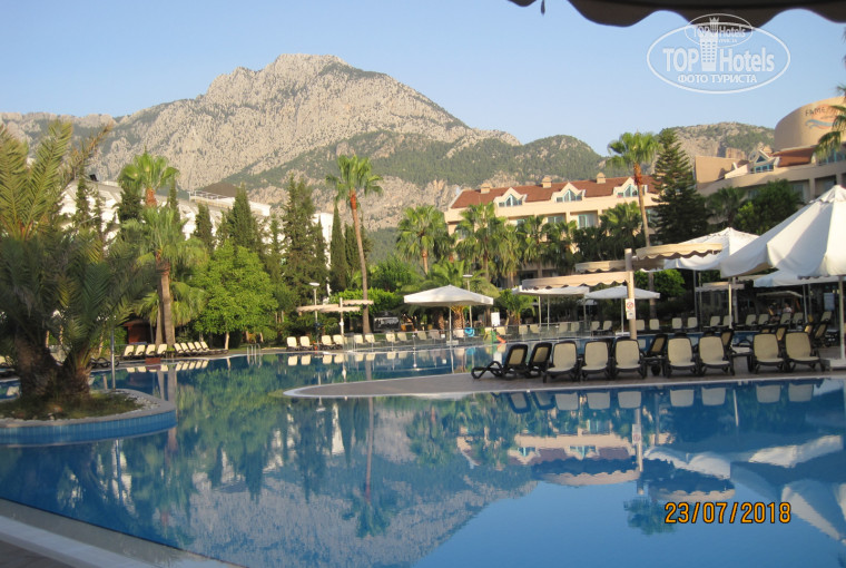 Территория. Территория отеля очень красивая и ухоженая. Есть большие бассейны, детский бассейн с горками. Между корпусами расположен фонтан, который очень красиво подсвечивается когда стемнеет.