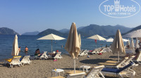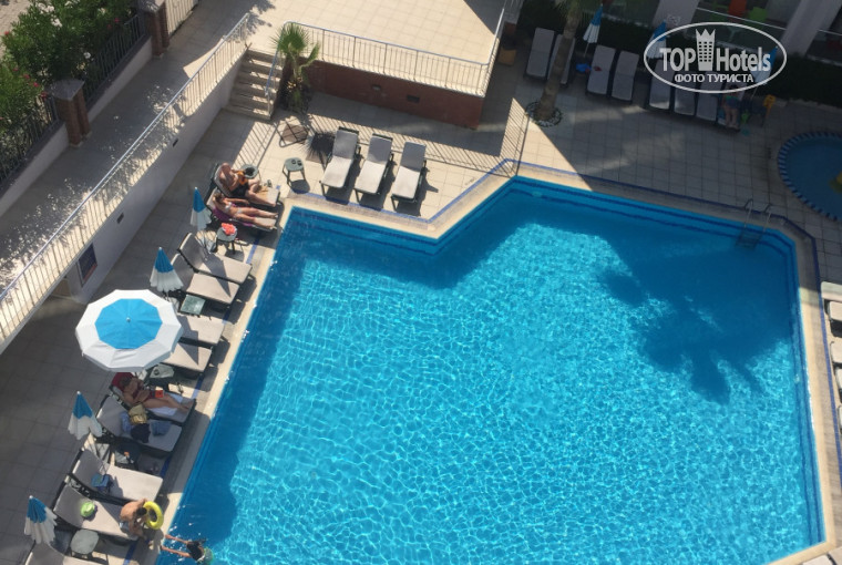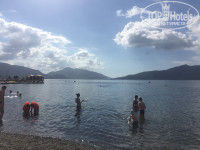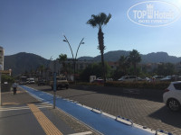 Отель в 5 минутах от моря. Не первая линия. У отеля нет своего пляжа, (это даже плюс, так как у отелей с первой линии свои пляжи, где лежаки стоят чуть ли не друг на друге) вы выбираете зону с хорошим заходом, с кафе покупаете кока колу за 7 турецких лир или 2 доллара, и отдыхаете на пляже, на шезлонге, где сосед от Вас чуть ли не в 3 метрах вправо влево вперёд назад. Я загарала при ресторане по названии "maymy" если смотреть на море от отеля он левее метров 300-500.
