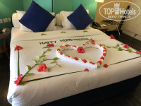 Привезли нас к заднему пирсу, встретили нас только на ресепшене, вручили ключи и отвезли в номер на электрокаре. Так доставляют на остров только туристов из Китая и русских, кто приобретает туры через туроператоров. Нормальных людей, кто летит на гидроплане встречают с там-тамами и песнями, прохладительными напитками, одевают им венки и ждут их на пирсе уже несколько электрокаров.