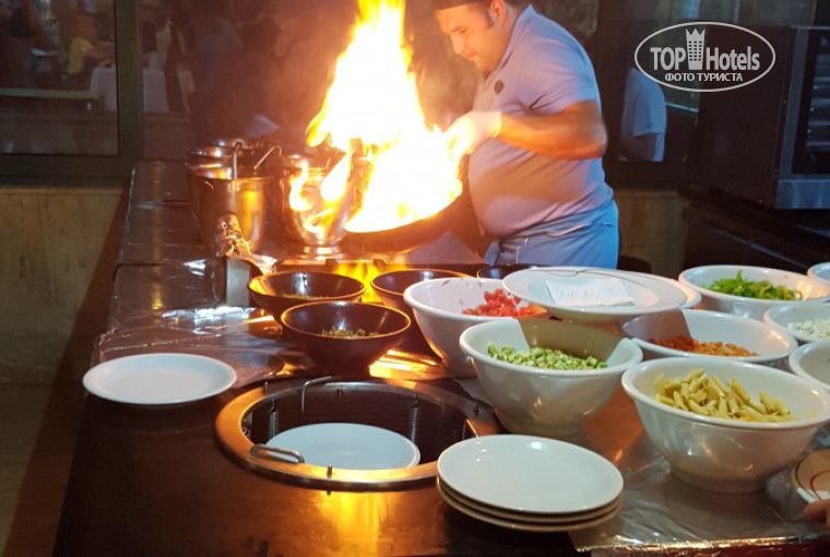 Основной ресторан (там где выдача блюд): это ад))) Идешь такой с тарелкой сквозь толпу, а там жарят, парят, сковородки в огне))) я не знаю, может для кого то это интересно)) но не мне, особенно в жару +38, стоять у горящей сковороды в очереди вообще не в кайф))) ОЧЕНЬ много жареного ну прям очень, порой даже ПЕРЕЖАРЕНОГО. Первый раз встретила отель где куча мяса и минимум овощей (кроме свежих, их навалом). Сырая картошка)) каши даже не стала пробовать после отзывов). Мясо всякое разное, и печень, и индейка, и баранина, курица и так и так и по другому)))). Рыба каждый день, вкусная (жарят прям в помещении все это). Сладости не очень, все стандартно и однообразно. Единственное вкусные вафли в ресторане Мериан. Хлопья на вкус никакие, молоко холодное. Блинчики вкусные с шоколадом и топами всякими, стандартно. Завтраки каждый день одно и тоже. На яйца (куриные)) ) сейчас не могу смотреть даже)) яичница глазунья, омлет рубленный, омлет рубленный с овощами, омлет тиипа с чем сам захочешь (при тебе жарят, стояла один раз за ним в очереди))) жалела что стояла, налили какую то жижу жирную и водянистую, аж подкатило…..) яйца вареные, яйца в смятку))) ну и колбаска ихняя турецкая, но съедобная вполне. Супов три вида было, нормальные с чечевицей второй гуляш, третий куриный бульон, но он из бульонных кубиков. Раков и креветок не было не разу. Из фруктов персики, груши, бананы, сливы, арбуз, дыня и еще инжир с червяками))))). Мороженое вкусное. Попкорн и сладкая вата вечером у бассейна, но очередь большая 1,5 часа стояли))). Очень понравилось что есть орешки, в основном там нут, но есть и арахис (соленые).
