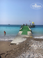 Море в августе теплое! Лазурное, но иногда несло мусор и какие то черные маслянистые лужи приплывали, наверно от яхт. Подход к морю действительно не приятный)) лучше в корралках, но в них мне было неудобно купаться. Нашла для себя подход сразу около пирса с левой стороны, есть маленький участок где меньше всего камней. Ну и с Пирса заходить тоже норм, но понятно что глубоко сразу. Пляж не большой, мест хватало но очень тесно, так как там не навес а зонты, и приходилось все время передвигать то зонты то лежаки чтобы не жариться на солнце, потом у нас большая компания (4+2), всегда находили лежаки чтобы лежать рядом. На пляже есть 2 душа, но вода очень холодная. Туалеты одни около детской площадки и одни около панорамного ресторана. В баре у моря пиво, спрайт, кола, вода, айс ти.