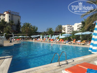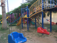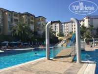 Территория отеля - большая. 2 больших бассейна и один для малышей. Есть 3 водных горки. Также есть детский клуб с большой детской площадкой, где недалеко есть, так скажем, "сад", где растут оливки, гранаты и красивые цветы. В общем, очень здорово. Территория чистая. Но пляж - в мусоре. До пляжа метров 100, недалеко. Пляж - песчаный, но будьте аккуратны при заходе в море с берега, там есть острые природные плиты. Лучше с пирса. Вода была о-о-очень теплая!