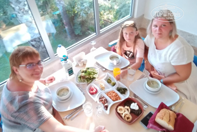 Всем привет. Хочу рассказать об отеле и поделится эмоциями. И так приехали мы в отель 11.08. В 10-00, нас встретил роскошный отель с огромным холлом, мягкими диванами и креслами. Ну как всегда на ресепшен предоставили все документы, а так же сопроводительное письмо с сайта tophotels.ru, нам сразу же дали понять, что мы важные туристы, заселили нас в 13-00. Номер на 3 этаже 3204, номер большой, просторный, чистый с видом на море, что очень порадовало. В номере была 1 двухспальняя кровать и 1 однушка, прикроватный столик, также стол на котором стоял телевизор и зеркало, большое. Так же был столик на котором всегда были фрукты. Балкон просторный и большой с двумя стульми и столик, и сушилка для белья. Ванная комната также просторная и чистая, полотенца большие, белые и чистые, ну и как всегда гель, шампунь и т.д даже мини набор нитки с иголкой, что очень пригодилось. Через час после заселения нам сделали подарок принесли вазу с фруктами и бутылку вина. Кстати в номере так же имеется холодильник, правда маленький. В целом номер очень понравился. После разбора чемоданы сразу отправились на море. По дороге на море мы зашли в снек бар, там всегда есть холодное пиво, вино и вода, ну и конечно есть что перекусить. Море чудесное, тёплое, чистое , прозрачное. На пляже есть лежаки с мягкими чехлами которых всегда хватало в любое время, так же есть душ 4шт. Бассейн 4 шт. 1 с горками, моей дочери очень понравилось невозможно было вытащить, 2. Общий глубина разная от 1м до 1.4 , вода в бассейне чистая, с утра даже проходная, но к вечеру прогревается, 3. Для самых маленьких, ну и 4. Мой любимый, прохладный, полу закрытый и мало людей. Лежаков у бассейна тоже всегда хватало, днем были всякие развлечения в воде, аквааробика, волейбол и т.д. на всей территории всегда была музыка. Персонал очень добрый, обслуживание хорошее. Дальше ужин, столовая большая, просторная 2 зала закрытый и открытый, в открытом зале есть бар, где всегда было вино, пиво, джин и т.д , самый лучший бармен именно там,?. Посуда чистая, всегда хватало тарелок, еда разная, на гарнир всегда есть фри, спагетти и рис, очень много овощей в разном виде, и тушеные и сырые и в салате и т.д.,из мясо в основном курица, индейка пару раз была говядина, но я человек не превередливый мне достаточно было того , что там имеется, очень много салатов, соленья, сыры, колбаса не очень. Сладости это безумно вкусно, их огромное колличество и не возможно пройти мимо такой вкуснотищи и красотищи. После ужина начиналась детская анимация, моему ребенку не очень понравилось, скучновато, и все одно и тоже каждый день, После детской дискотеки, естественно начиналась взрослая, она находится в снек баре, в подвале, это плюс большой так как она длилась с 23-30 до 2-00 никому не мешала музыка, дискотека мне понравилась музыка популярная, танцевальная, но очень громко, там же можно было выпить пиво , вино и т.д. Кстати забыла сказать, что с 23-30 до 00-00 В столовой был ночной супчик всем советую , очень вкусненько, только не в коем случае не берите суп по виду из курицы (он на самом деле из баранины и очень неприятный был запх?) обычно перед дискотекой туда заходили. Для тех кто не хочет идти на дискотеку есть Лоби бар, бармен там огонь, за 1$(чаявые) такую вам коктелюху забацает ?. Там отлично ловит интернет, и соответственно, люди прекращаются в интернетовских зомби. Еще есть замечательный р