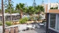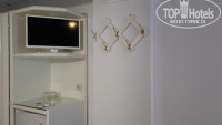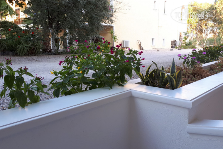 Ночевали в отеле одну ночь в рамках двухдневной поездки на Санторини с Крита. Отель вместе с соседним отелем Санта Елена расположен на окраине Камари почти на пустыре около дороги. До пляжа от отеля почти километр, до ближайших магазинчиков с полкилометра. У нас был номер не в основном здании, где ресепшн, а в соседнем, левее, рядом с бассейном. Номер был 113, в полуподвальном помещении. Уровень пола в номере ниже уровня земли, при этом в номере и соседних номерах есть балкон, «перила» которого, находятся на уровне дороги в садике. Очень интересное архитектурное решение. При этом, когда пошел ливень (а был он достаточно приличным в течение получаса), вода в балкон не натекла, но вывешенное на просушку бельё (на балконе натянута веревка для сушки белья) изрядно пострадало от брызг от удара капель о дорогу и перила балкона.