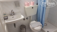 В центре номера на потолке большой и относительно не шумный вентилятор. Есть и кондиционер с пультом управления к нему, но мы его не включали, вентилятора вполне хватало. Есть холодильник, небольшой ЖК-телевизор (не включали), фен, сейф в шкафу, от которого дают ключ вместе с ключом от номера. Душевая кабинка со шторкой, горячая вода была всегда, есть жидкое мыло и бутылочки с шампунем (после неимоверно жесткой воды в отеле на Крите, наконец-то удалось вымыть голову). В номере чисто, две кровати вплотную друг к другу, белье чистое, только махровые полотенца далеко не новые, какие то тяжёлые и «колючие».