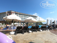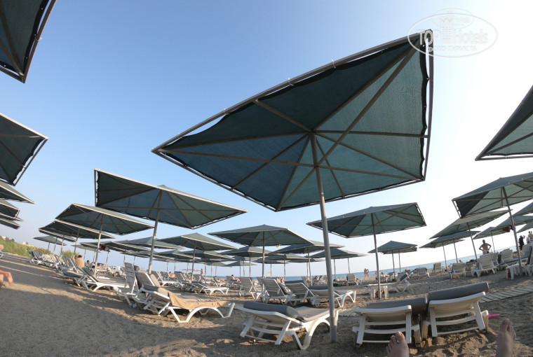 Берег песок с галькой. Спасатель и жандарм всегда на месте. У бассейна водные горки.