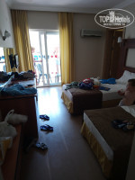Приехали в 6 утра, заселили в двух комнатный номер к 12, как и оплачено. Номер в основном корпусе на 2 этаже уютный не большой, без живности и посторонних запахов. Убирали хорошо каждый день, чаевых не оставляли. Персонал отзывчивый. Безлимитный вайфай был очень очень приятен. Еды много, но в основном однообразная, мы всегда наедались, дети ели мало, но были всем довольны. Фрукты разные: сливы, груши, апельсины, всегда арбузы и дыня. Десертов мало, молоко порошковое. Из мяса курица в разных вариациях. Рыба лично мне не понравилась. Йогурт, пара салатов, сухие завтраки, булки одни и те же, пара супов-пюре... Макарошки, пюре и прочее... Детские стульчики есть страшненькие, но пойдёт. От напитков типа юпи аллергий и отравления не было, мы их разбавляли. Коктейли алкогольные простенькие типа малибу спрайт, виски кола или джин тоник, но наливают и неразбавленный виски. Детям колу, фанту, спрайт со льдом.