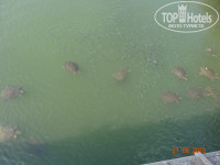 Слева от отеля, если выйти на пляж можно увидеть устье реки (там еще парусник стоит, его видно с пляжа). Через реку есть мостик, куда утром приплывают большие черепахи. Как оказалось, эти черепахи очень любят сыр. Шли туда где-то полчаса по пляжу. Обратно шли большую часть по променаду, остальную часть по пляжу.