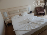 Заселение: в отель прибыли в 9 часов утра. В 10 часов нам дали прекрасный номер 454 на 4 этаже. Номер очень чистый, с большим балконом на противоположную сторону от бассейна. Вид был на соседний отель, но в стороне было видно море. В номере работало все. Кондиционер охлаждал хорошо. По телевизору были российские каналы, но мы его смотрели очень мало. Большая двухместная кровать, 2 тумбочки. В ванной комнате все необходимое имелось. Она не большая, но нам было не тесно. Феном не пользовались. Всего два раза просили убраться, а в остальные дни просто брали воду и убирали мусор. Мы поддерживали чистоту сами. Но убирают чисто, без нареканий.