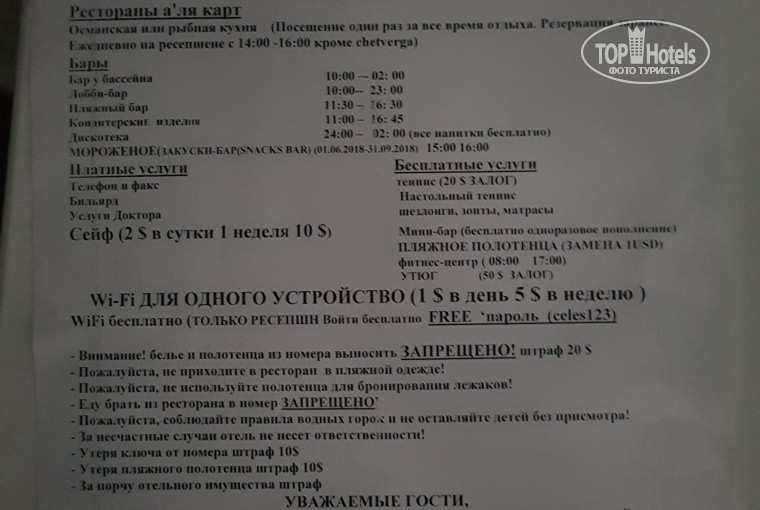 РЕБЯТА ОГРОМНАЯ ПРОСЬБА ЕСЛИ ВЫ ПОЕХАЛИ В ЭТОТ ОТЕЛЬ . И с этого отеля поехали от любого гида на экскурсию в Памуккале , вас будут зовозить в винный погребок ни чего не покупайте из вина там очень дорого нас обманули 2 бутылки вина + лексир из хлебного дерева 68$ , хоть оно и вкусное, лучше купить на базаре не далеко от отеля там бутылка вина стоит 10 $. Вас будут завозить есть (бесплатно ) но вода там платная - берите собой воду из отеля .
