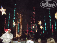 Нам повезло, и в ГОА мы застали 25 декабря - Рождество у католиков. В Бенаулиме (деревеньке, расположенной в 1,5 км от отеля, если идти по асфальтовой дороге налево от отеля) разрисовали все витрины магазинов. Кстати, пляж назван именно в честь этой деревеньки. Деревня -Бенаулим, пляж -Бенаулим. Территорию отеля украсили большими стеклянными елочными шарами, гирляндами, звездами, фонарями. Нарядили елочки. На каждую дверь повесили рождественские красно-зеленые сапожки. Был и шикарный банкет на свежем воздухе - о чем мы узнали за несколько дней до этого и для нас это было приятной неожиданностью. На всех отдыхающих + гостей ресторана были зарезервированы столики. Крепкие спиртные напитки, соки, фрукты. На сцене - рождественские напевы хора девушек. После концерт. Блюда экзотические. Шведский стол - берешь, что хочешь. Десерт. Конкурс на лучшего танцора. Надо отдать должное - россияне в этом преуспели. В завершении всего - праздничные фейерверки. Очень романтично - верхушки пальм и небо, испещренное фейерверками.