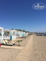Пляж достаточно чистый , вместительный, 2 пирса, кабинки для переодевания, душ. В паре шагов бар Mare с молочными коктелями для детей и напитками для взрослых. Море теплое, как молоко, чистое, заход в море не очень удобный, но это буквально 1,5-2 метра а потом уже и песочек есть и глубина идет.