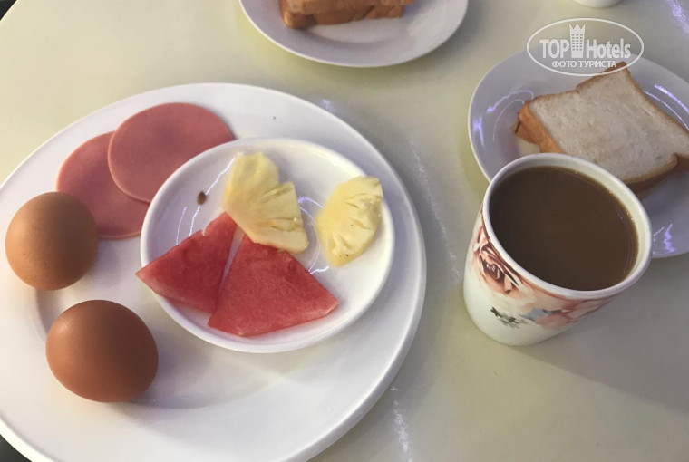 По факту: шторы в номере с года постройки отеля, завтрак чередуется, как пояснили один день американский завтрак ( хлеб- можно тост, масло-маргарин, джем(сгущённый кисель), 2 кусочка колбасы, 2 кусочка арбуза толщиной 2-3 мм, примерно как колбаса, кофе - нескафе классик, если понимаете что это, либо чай. Второй день- типа тайский завтрак- те же напитки, хлеба нет, масла нет, сгущеного киселя нет, есть только макароны с подливой, обязательно холодные!!!