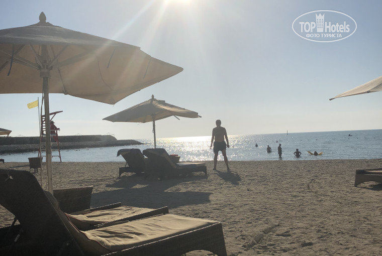Отель стоит прямо у моря! Лежаков немного, но всем хватает.Полотенца выдают в неограниченном количестве! Матрасы уже старенькие! Вход песчаный пологий. Море чистое, но прохладное. Для меня холодное, но купаться можно конечно. Всегда дул сильный ветер,жары не ощущалось . Один раз была песчаная буря после обеда, песком занесло. Ветер стих только , когда нам уезжать надо было. Один день загорали без ветра. Температура воздуха примерно 26 градусов была. Воды не знаю точно, может 21.В 17:00 уже темнеет, закат обалденный. Возле бассейна бар, там разные напитки за доп.плату. Мы не брали, так как у нас вход в лаунж.