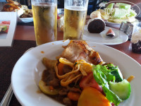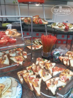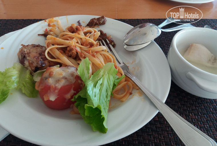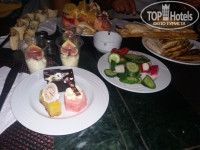 Обед: супы (крем суп, бульоны и т.д.), курица, баранина, индейка, телятина, говядина, перепела, разная рыба, колбаски, сыры, масла, что-то похожее на нашу ветчину, много салатов и овощей, разный рис, картоха, паста нескольких видов, какая-то белая масса с жареным луком по вкусу напоминает жареные лисички с луком. При посетителях готовят пиццу или мясные пироги. Бананы, гранат, финики, апельсины и т.д. Много выпечки.