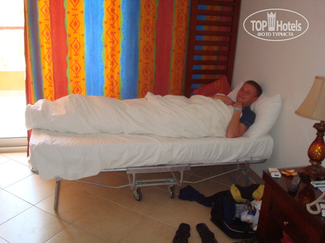 3.Сервис.Вопросы возникли с самого начала нашего приезда. На рецепшене дали 15баксов и попросилили чтобы номера дали рядом 2-х мес.,3-х мес. и 2+ребенок.А дальше еще интереснее. Дали.На третьем этаже на 3-х пацанов-двуспальную и одиночную, на 2-х+ребенок номер с одной двуспальной кроватью, а нам на двоих две одиночные и все это удовольствие за 15 баксов.Ладно с номерами спустя пол-дня разобрались, пацанов заселили в двухместный номер и прикатили раскладушку похожую на койку в больничной палате, мы ее назвали "КАТАЛКА".Фотка прилагается.На номер с 2-х летним ребенком прикатили такуюже каталку вместо детской кроватки чайник не прилагаеся только платно 5евро.В киоске где получают полотенца всегда теряются карточки и почему-то только у людей которые только приехали, и почему-то все русские.Воду в бутылках не дают, только в кулере в столовой.В баре 2бакса.Ну и в последний день отпуска сюрприз.Как-то лежа на пляжу к нам подошел один из работников рыбного ресторана на территории отеля и предложил посетить иго за 28$.Его решила посетить моя девушка.В последний день я решил оплатить его и тут ОПА,оказывается не 28 а 32$. Дело не в деньгах-это копейки, вопрос у меня встал принципиально-обман.Наш гид от Мос-трэвэл этот вопрос не решил, да и не старался.Пришлось в очередной раз поругаться.Также за все время произошел еще ряд мелких нюансов которые подпорчивали отдых.В общем это не 5* и он со своим персоналом и услугами не стоит этих денег, а главное и здесь пытаются обмануть и развести нашего Российского туриста.Я туда ни ногой.