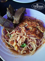 Питание... Я по натуре мясоед и сладкоежка. В этом плане мне всего хватило. Курица, говядина, рыба, макароны, рис, картофель, зелень, фрукты. Всего в достатке и разнообразно. Мы не приходили к началу, так как очереди (как и в любом другом отеле). Мы приходили час-полтора после. В наличии было все, кроме помидор и огурцов свежих. Вот эти ставят один раз и не дорезают. Спиртное бесплатно наливают до 23.00, потом все спиртное платное. Напитки ВСЕ (кроме пива) оооооочень разбавлены, даже соки. Это минус. А самый большой минус - это посуда. Она вся битая, со сколами. Это ужасно. Отдельно хочу сказать про кофе, здесь он только растворимый, кофемашин нет. Чай только липтон в пакетиках. Печально.