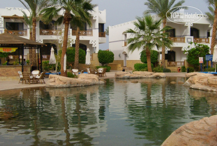 Территория нам очень понравилась. По размерам, думаю, средняя, но хорошо продуманная. Шесть (вроде бы) бассейнов - один обычный керамический, остальные стилизованные под естесвенные водоемы (нам понравился больше который у моря), и водная дорожка с горочками, водопадиками, пальмочками. Немерянно всяких дорожек, тропинок, спусков-подъемов, лесенок. Добавить сюда всевозможную растительность (пальмы, пышно-цветущие кусты, разнообразные деревца, ухоженные газоны). Египетские цапли на территории тусят) А по вечерам все это и вовсе фантастический вид принимает - фонарики спрятаны в кустах, на пальмах, и даже водоемы освещены по-особенному. В общем, гулять - одно удовольствие, с душой все сделано.