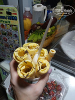 Теперь по еде на улице,отель расположен на очень оживлённой улочке,на ней есть почти всё,что хочется,обязательно попробуйте местное мороженое,делают вьетнамцы со шпателями в руках,очень эффектно и очень вкусно,готовят при вас,начинают работать обычно с 10.30-11.00 утра.Вечером на этой же улочке готовят блинчики с разными начинками,мы тоже кушали,очень вкусно,брали с фруктами,с мясом не решились брать.Всякие полудохлые креветки и лобстеры нас не вдохновили,побоялись их брать на улочке.А вот дуриан попробовали наконец-то,в Тае не решились и оказалось,что зря.Там же вечером на улочке сидят и вскрывают при вас этот чудо-фрукт,возьмите маленький кусочек на пробу,прям там же сразу и скушайте,мы с мужем были приятно удивлены вкусом.Минут через 15 уже начинает вонять,ешьте сразу как вам его вскрыли,не тяните.