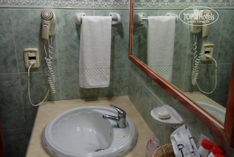 Сантехника коцанная со следами экзотического ремонта, но все работает, напор отличный, такой горячей воды не встречали не в одном отеле. В ванной комнате фен, два стеклянных стакана, розетка на 220V, биде, ванная с занавеской и гибкий душ с крепежом для фиксации на стене. Ёршика нет, но вместо него отлично справляется душ, длины шланга хватает. При заезде набор туалетных принадлежностей 2 зубные щётки с пастой, 2 бритвенных станка с кремом для бритья, шапочка для душа, пузырьки с шампунем, гелем для мытья и кремом для тела.