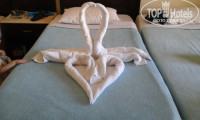 Нас заселили в номер где то в центре с видом на сад - ничего не давали, вид хороший, приятный, до ресторана\ресепшена минуты 3 идти, до пляжа минут 5 не торопясь, нас вполне устраивало. В номере все работало, единственное что у нас было указано 1 двухспальная кровать и 1 односпальная, а у нас в номере было 2 односпальные. Мы приехали вечером и не стали уже с этой кроватью решать, попросили чтобы принесли, на следующий день еще раза 3 напомнили и у нас было 3 односпальные кровати. Комары сильно не донимали, но на улице если вечером сесть покусывают. В нашем номере было только мыло жидкое, но мы знали заранее и взяли все остальное с собой. Там к слову душ, а не ванна. Полотенца меняли каждый день днем, часто оставляли что-то из полотенец, ребенку нравилось.