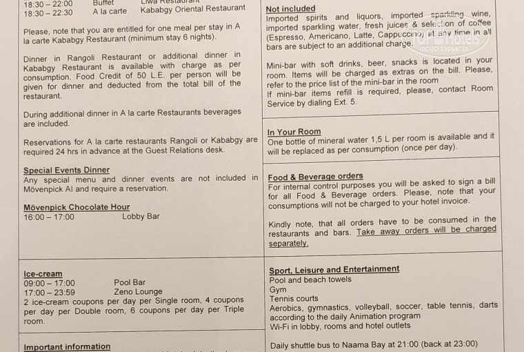 минусы считаю не значительными (они присутствуют во всех отелях шератон, сентидо, мовенпик и я думаю в большинстве отелей в египте: очень медленный персонал при раздаче напитков в ресторане, иногда блюда не съеденные вечером выставляются для употребления с утра, очень мало фруктов, нет гуавы, арбузов, гранат, манго тоже нет. очень сложно до бронирования получить информацию о том , что включено в систему all inclusive (мне эту информацию так и не прислали)